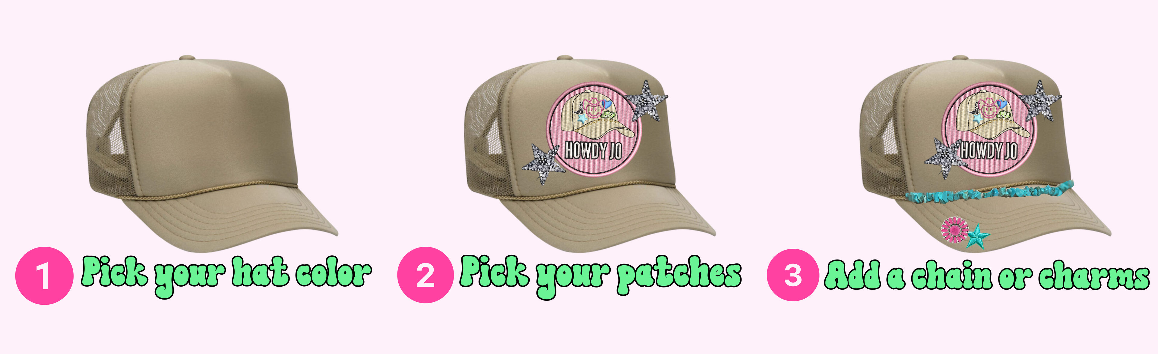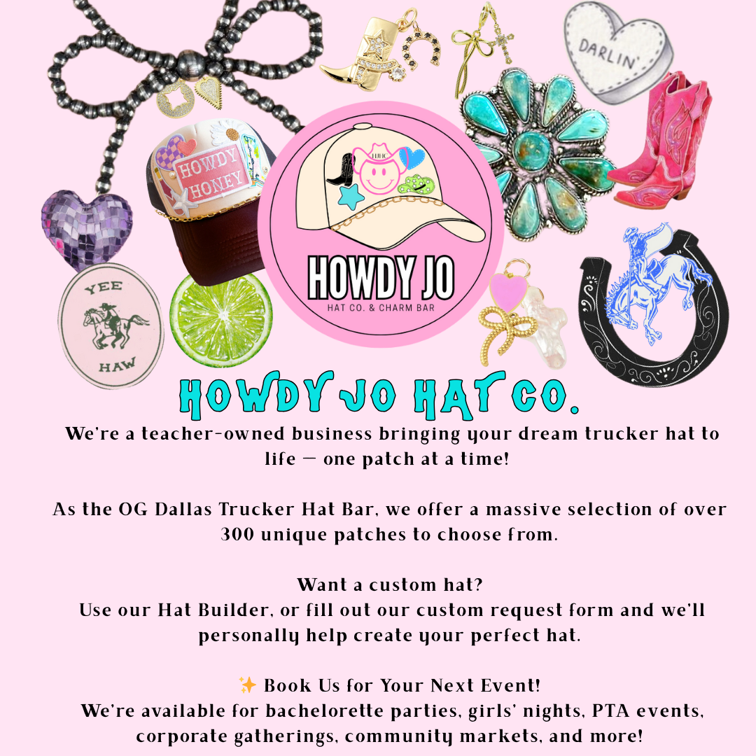 Have Howdy Jo Hat Co. set up our full custom hat bar at your upcoming event. Perfect for various occasions like sorority gatherings, bachelorette parties, school events, college functions, birthdays, corporate events, boutique showcases, and community gatherings.