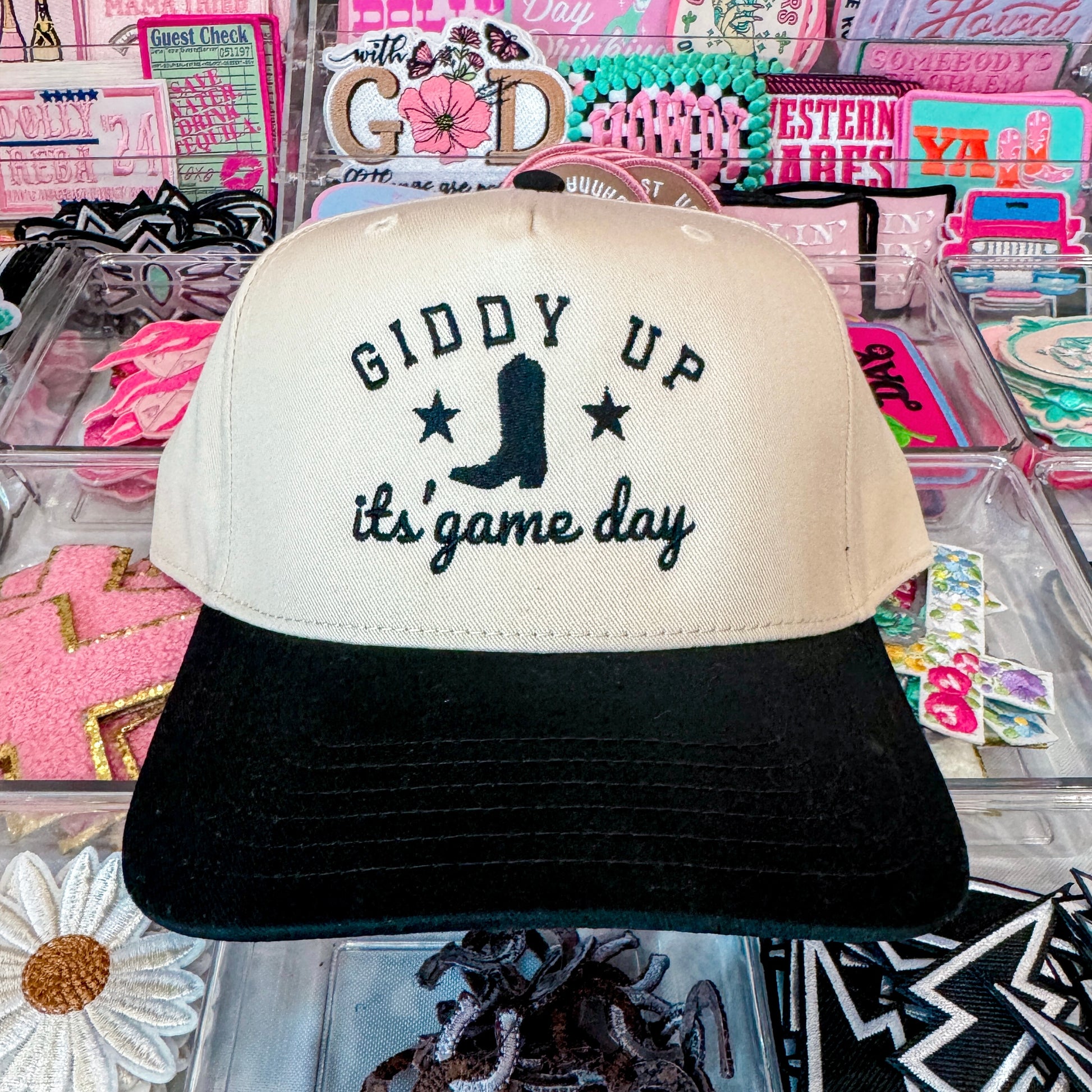 Get ready for the ultimate college game day experience with our Giddy Up It's Game day Hat! This cowgirl-inspired canvas trucker hat is the perfect addition to any fan's wardrobe. Show off your team spirit with style and comfort. Yeehaw!