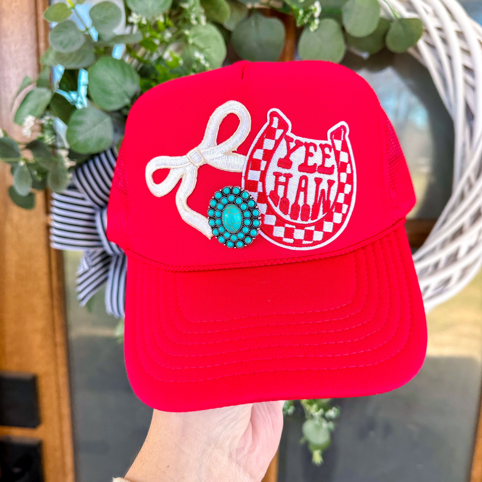 Red trucker hat with bow patch and yeehaw checkered horseshoe patch. Turquoise concho pin attached as well!